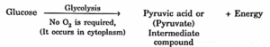 - First step: The first step which occurs in cytoplasm is called glycolysis. It does not require oxygen. In this step glucose is partially broken down into an intermediate compound (pyruvic acid) and only a small amount of energy is released.