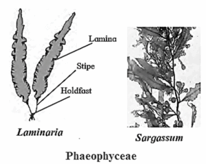• Mannitol, laminarin are stored food materials. Body is usually differentiated into holdfast, stalk called stipe and leaf-like photosynthetic organ called frond.