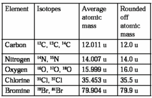Average atomic mass : An element may have different isotopes i.e., atoms having same number of electrons and protons but different number of neutrons. The isotopes have different atomic masses and they exist in different proportion or abundance. The atomic mass of an element is the weighted average of atomic masses of its isotopes. This is called average atomic mass, Isotopes with relative abundances and atomic masses as shown against each of them. From the above data, the average atomic mass of carbon = (12 u) (98.892/100) + (13.00335 u) (1.108/100) + (14.00317) (2 × 10-10/100) = 12.011 u Similarly, average atomic masses for other elements can be calculated.