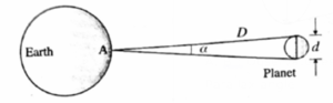 The angle on between these two directions gives the angular size of the planet, i.e., the angle subtended by the planet at A. If d is the diameter of the planet, d = αD. Hence, having determined D and measuring a, we can determine the diameter d of the planet.