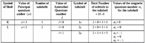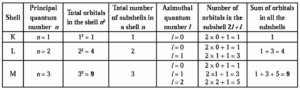Distribution of orbitals in shells and subshells : Below Table shows orbitals in the first four shells with the three quantum numbers for each orbital.
