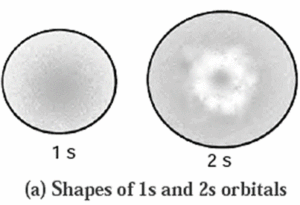 Shapes of atomic orbitals : Orbital : The three dimensional region in the space around the nucleus of an atom in which the probability of finding the electron is maximum is called orbital. Shapes of 1s, 2s orbitals : Figure shows the boundary surface diagram of atomic orbitals 1s and 2s, which are spherical in shape. Here, a boundary surface is drawn in space for an orbital such that the value of probability density Ψ2 is constant and encloses a region where the probability of finding electron is typically more than 90%. Such a boundary surface diagram is a good representation of shape of an orbital. p-orbital : d-orbital : The shapes of 3d, 4d, 5d ..... orbitals are similar but their respective size and energies are large or they are said to be more diffused.