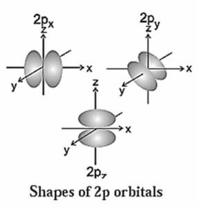 (2) p-Subshell : For this subshell, l = 1, m = +1, 0, −1. Hence p-subshell has three orbitals represented as px, py and pz and they are respectively oriented along x, y and z axes. Therefore p-orbitals have three-fold degeneracy.