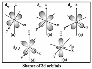 (3) d-subshell : For this subshell, l =2, m = +2, +1, 0, −1, −2. Hence, d-subshell has five orbitals with five different orientations. They are designated as dxy, dyz dxz, which are planar orbitals and , are axial orbitals. Therefore d-orbitals have five-fold degeneracy.