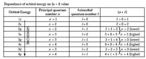 Among two orbitals having same (n + l) value, that orbital with lower value of n will be filled first. For example, 3d-orbital (n + l = 3 + 2 = 5) is filled prior to 4p-orbital (n + l = 4 + 1 = 5).