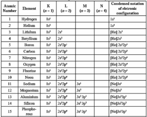 Electronic configuration of the first fifteen elements
