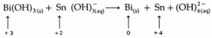 2Bi(OH)3 (g) + 3Sn(OH)3 (aq) + 3OH (aq) → 2Bi (s) + 3Sn(OH)62— (aq)
