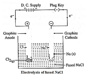 (1) Construction of cell : The electrolytic cell consists of a container in which fused NaCl is placed. Two graphite electrodes are immersed in it. They are connected by metallic wires to a source of direct current that is battery. This is shown in fig.