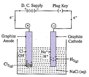 (1) Construction of an electrolytic cell : It consists of a vessel containing a NaCl aqueous solution. Two inert electrodes (graphite electrodes) are immersed in it and connected to an external power source, such as a battery. The electrode connected to the negative terminal is referred to as a cathode, while the electrode connected to the positive terminal is referred to as an anode.