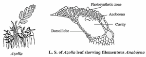 - Azolla : A free-floating water fern. Anabaena present in the dorsal leaf lobe fixes nitrogen.