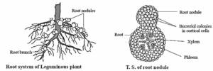- Rhizobia : Nitrogen fixing bacteria in root nodules of leguminous plants. e.g. R. leguminosarum is specific to pea and R. phaseoli is specific to beans.