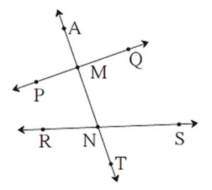 When a transversal intersects two lines, two distinct points of intersection are created (e.g., points M and N). At each point, four angles are formed, totaling eight angles. Each angle has one arm on the transversal and the other on one of the intersected lines.