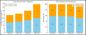 Question 1.2. In the table given below, the information is given about roads. Using this draw sub-divided and percentage bardiagram (Approximate the percentages to the nearest integer)