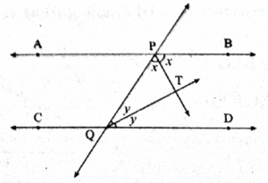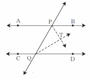 Given: line AB || line CD and line PQ is the transversal. Ray PT and ray QT are bisectors of BPQ and PQD respectively.