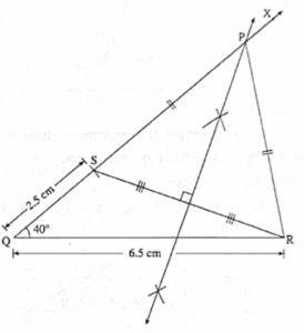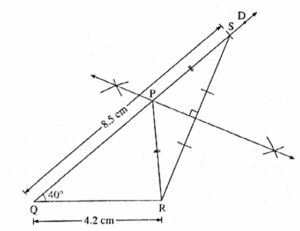 - Draw perpendicular bisector of SR which intersects ray QD. Mark the point as P.