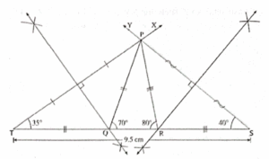 - Draw the perpendicular bisector of seg PT and seg PS intersecting seg TS in Q and R respectively.
