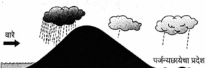 प्रश्न २. पुढील आकृती पहा व पावसाचा प्रकार अचूक ओळखा. असा पाऊस कोणत्या प्रदेशात पडतो ते लिहा.